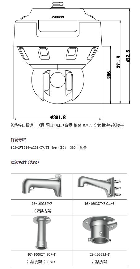 iDS-2VPD14-A237-DV/SP(5mm)(B)星光級全景網(wǎng)絡高清智能球機,采用一體化設計,單產(chǎn)品即可同時提供全景與特寫畫面,兼顧全景與細節(jié)。其中全景畫面由8個傳感器拼接而成,可實現(xiàn)360度的全景監(jiān)控;一體化機芯和高速云臺設計,在全景監(jiān)控的同時為用戶提供快速細節(jié)定位功能。另外全景球機還集成了先進的視頻分析算法和多目標跟蹤算法程序,可實現(xiàn)自動或手動對全景區(qū)域內(nèi)的多個目標進行區(qū)域入侵、越界、進入?yún)^(qū)域、離開區(qū)域行為的檢測,并可輸出報警信號和聯(lián)動云臺跟蹤,從而滿足高等級要求的安保需求。
