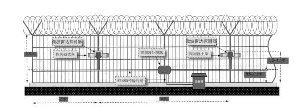 探測器采用壁掛方式布設(shè)在圍欄上,探測器之間通過RS-485總線相連,并匯聚到探測處理主機。此方案融合微波雷達和MEMS振動兩種入侵探測技術(shù),兼具主動和被動探測方式,具有預(yù)警距離遠,定位精度高,適應(yīng)性強,易于安裝和調(diào)試等特點,適用于民航、核電、物流、石油、電力、煙草、公安、司法等行業(yè)。